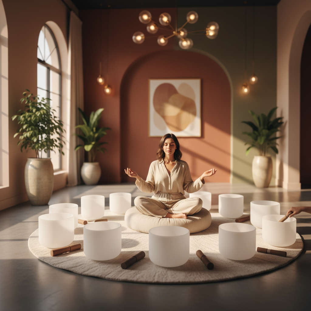 - دمج النبضات بكلتا الأذنين مع حمامات الصوت: نستخدم مزيجًا فريدًا من النبضات بكلتا الأذنين، المصممة لتحفيز ترددات موجات دماغية محددة تدعم التركيز والاسترخاء، مع حمامات الصوت الغامرة باستخدام أدوات مثل الأوعية الغنائية الكريستالية، والغونغ، والشوكات الرنانة. هذه المكونات تخلق بيئة صوتية غنية تعمل على مستويات متعددة.