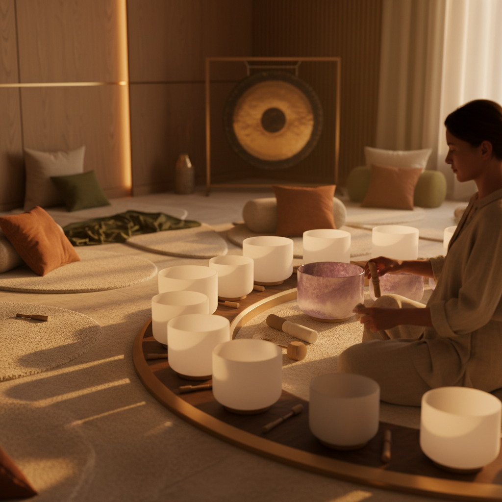 عندما تدخل إلى إحدى جلساتنا، ستغمرك بيئة مصممة لتعزيز السلام الداخلي. تبدأ الجلسة غالبًا بتقنيات التنفس الموجه لتهدئة الجهاز العصبي، تليها الاستماع إلى ترددات صوتية مختارة بعناية. يتم استخدام مجموعة متنوعة من الأدوات مثل الأوعية الغنائية الكريستالية، والغنغ (الصنوج)، والشوك الرنانة، التي تنتج موجات صوتية وترددات اهتزازية عميقة.