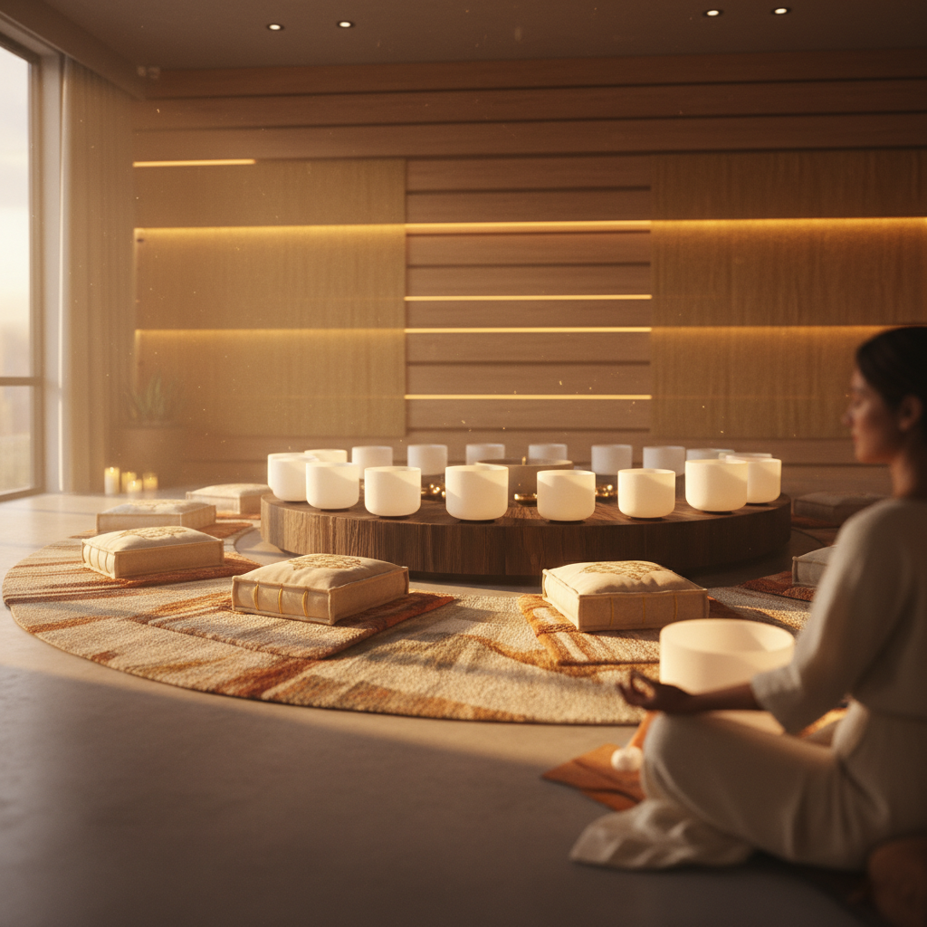 يمكن للصوت أن يعمل كعامل حاسم في تعزيز التأثيرات الإيجابية لهذه الطقوس. فالاهتزازات الصوتية، من خلال آلات مثل الأوعية الغنائية أو الغونغ، يمكن أن تحفز حالة من الاسترخاء العميق، وتساعد على التناغم بين الموجات الدماغية نحو ترددات ألفا وثيتا المرتبطة بالهدوء والوعي المتزايد. هذا التناغم الصوتي يخلق بيئة مشتركة للهدوء، حيث يمكن للأزواج أن "يستمعوا" معًا ليس فقط بأذنيهم، ولكن بأجسادهم وعقولهم.