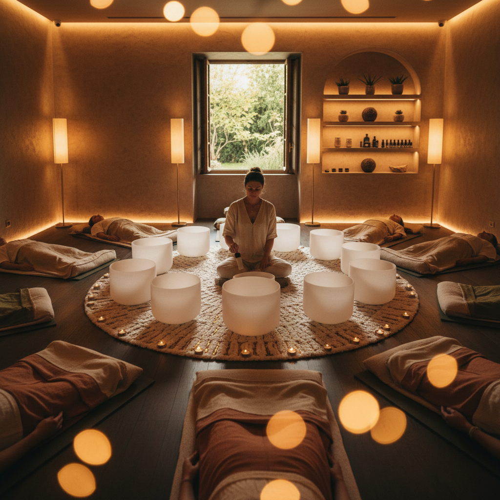 تخيل الدخول إلى مساحة هادئة، حيث تغمرك الأصوات المريحة للآلات الصوتية. الاهتزازات الرقيقة للأوعية التبتية، والرنين العميق للغونغ، والنغمات المهدئة للشوك الرنانة، كلها تعمل معاً لخلق "تدليك صوتي" للجهاز العصبي. هذا لا يساعد فقط على خفض مستويات الكورتيزول (هرمون التوتر)، بل يعزز أيضاً إنتاج هرمونات الشعور بالسعادة مثل الأوكسيتوسين والسيروتونين.