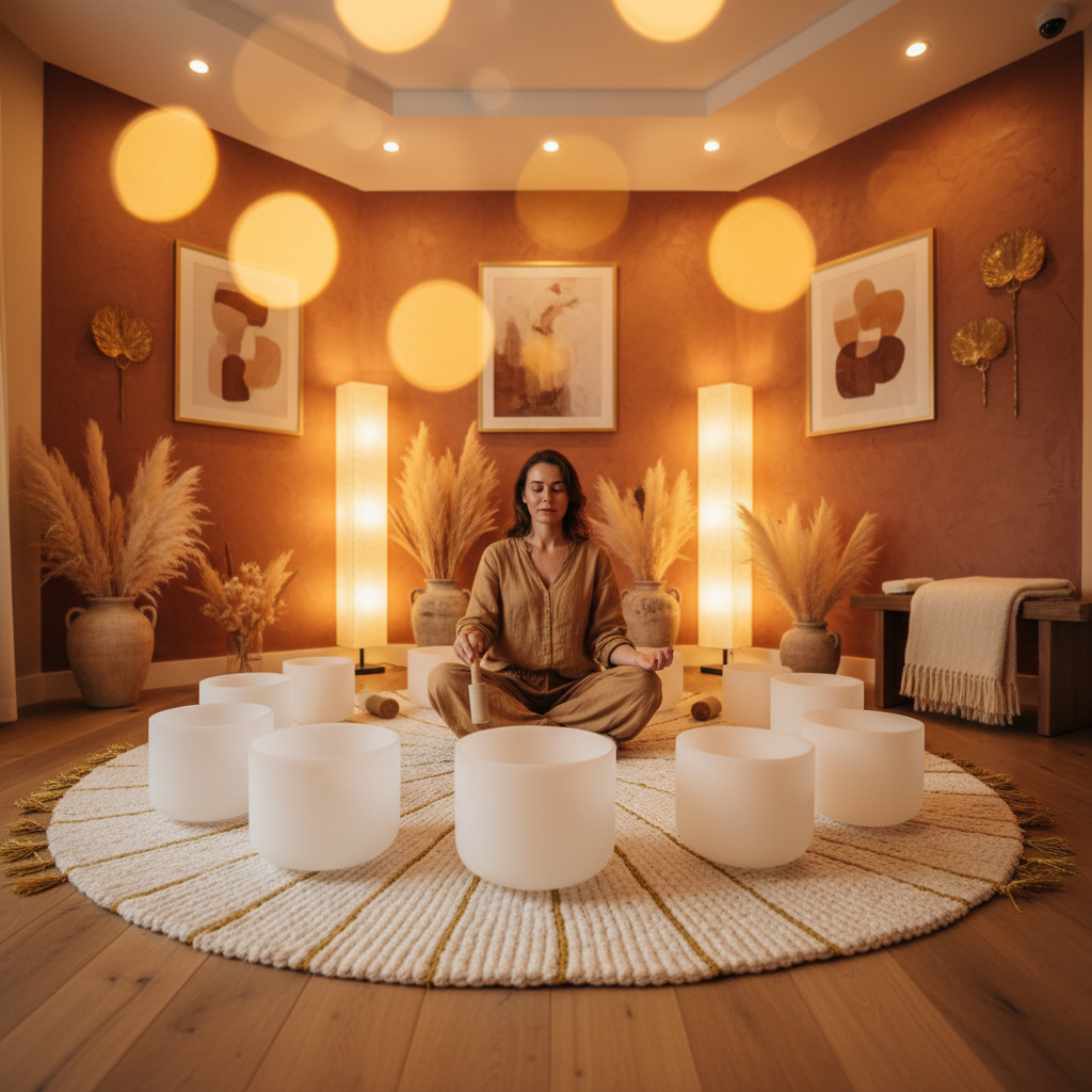 - دمج الأدوات الصوتية العلاجية: في جلساتنا، ندمج مجموعة متنوعة من الأدوات الصوتية مثل أوعية الغناء الكريستالية، والغونغ، والشوكات الرنانة. تُستخدم هذه الأدوات لخلق اهتزازات وترددات معينة قد تدعم الاسترخاء العميق وتهدئة الجهاز العصبي، مما يساهم في بيئة مثالية للتعوّد.