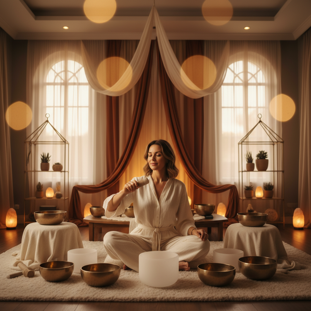 Stellen Sie sich vor, Sie liegen bequem auf einer Matte, umgeben von sanften Decken und Kissen, in einem Raum, der Ruhe ausstrahlt. Die Lichter sind gedämpft, und die Luft ist erfüllt von einer Atmosphäre der Gelassenheit. Dann beginnen die Klänge. Sie stammen von einer Vielzahl von Instrumenten – tibetischen Klangschalen, Gongs, Stimmgabeln und Windspielen –, die von einem erfahrenen Praktizierenden sanft gespielt werden.