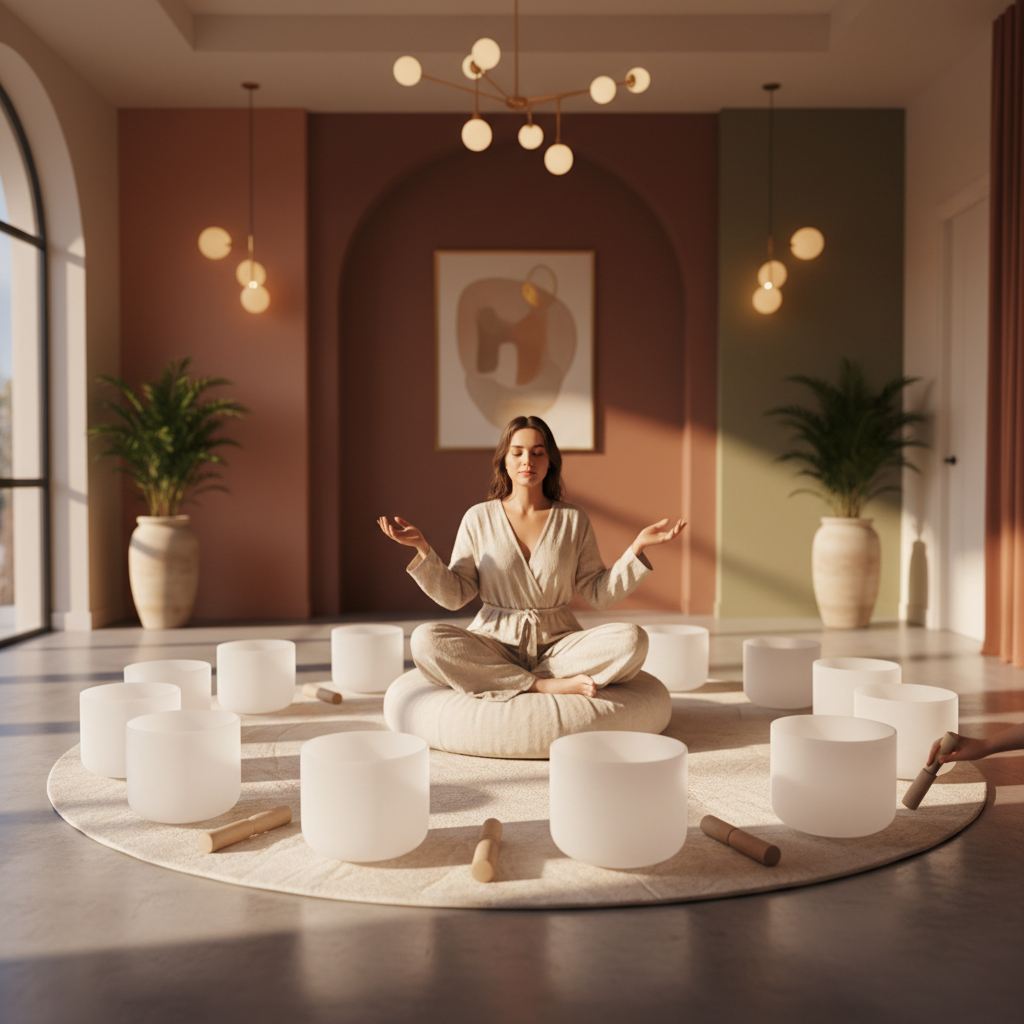 - Himalayan & Crystal Singing Bowls: Placed on or around the body, their pure tones and vibrations can be felt directly, promoting deep release.